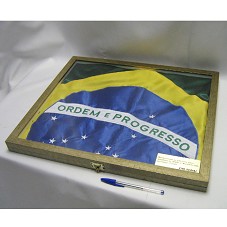 BANDEIRA DO BRASIL DOBRADA E ACONDICIONADA EM ESTOJO DE MADEIRA (51X44X4 CM), COM TAMPA DE VIDRO, ONDE HÁ PLACA METÁLICA CONTENDO A GRAVAÇÃO 'BANDEIRA LEVADA AO PÓDIO PELOS ALUNOS MEDALHISTAS DO SENAI NO WORLD SKILLS 2009 EM CALGARY - CANADÁ / CNI SENAI'. FIXADA NO ESTOJO COM FITA ADESIVA.