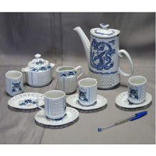 CONJUNTO PARA CHÁ COMPOSTO POR: SEIS XÍCARAS ACOMPANHADAS DE PIRES, UM BULE COM TAMPA, UM AÇUCAREIRO E UM BULE PEQUENO. EM CADA PEÇA, PINTURA EM TONS DE AZUL, DE MOTIVOS FLORAIS. NO BULE MAIOR, PINTURA COM DESENHO DE DRAGÕES. NO FUNDO DE CADA PEÇA, IDEOGRAMA CHINÊS. ACONDICIONADO EM ESTOJO FORRADO DE TECIDO ESVERDEADO.