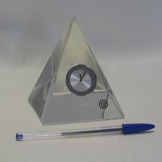 RELÓGIO DE MESA (11X9,5X9,5 CM) NO FORMATO DE UMA PIRÂMIDE, CONFECCIONADA EM CRISTAL. INCRUSTADO NO CENTRO DA PIRÂMIDE, RELÓGIO ANALÓGICO (35 MM), DE FORMATO CIRCULAR, EM METAL, SEM NUMERAÇÃO. POSSUI SELO DO FABRICANTE E ASSINATURA NA BASE INFERIOR. ACONDICIONADO EM CAIXA DE PAPELÃO CINZA ESCURO, COM NOME DO FABRICANTE INSCRITO. ACOMPANHA CARTÃO DE CUMPRIMENTO EM NOME DO AGENTE.