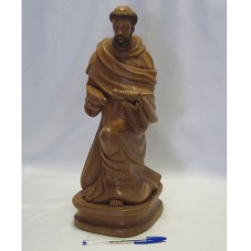 ESCULTURA (40,5 CM) ENTALHADA EM MADEIRA, REPRESENTANDO SÃO FRANCISCO DE ASSIS, AJOELHADO, SEGURANDO UMA POMBA EM CADA MÃO. NA PARTE POSTERIOR DA BASE, A INSCRIÇÃO 'PAULINO'.