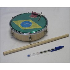 TAMBORIM (5X16,5X16,5 CM) COM A BANDEIRA DO BRASIL ESTAMPA NO TAMPO. ACOMPANHA BAQUETA DE MADEIRA CLARA (28,5 CM) E INSTRUMENTO PARA APERTAR PARAFUSOS.