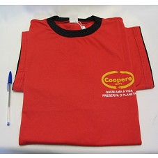 CAMISETA (TAM G) EM MALHA VERMELHA, DE MANGA CURTA. NA FRENTE, EM AMARELO E BRANCO, A INSCRIÇÃO 'COOPERE CENTRO / QUEM AMA A VIDA PRESERVA O PLANETA'. ATRÁS, EM TAMANHO MAIOR, MESMA INSCRIÇÃO.