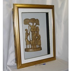 QUADRO (80,5X62,5 CM) COM MOLDURA EM MADEIRA LAMINADA DE DOURADO, PASSE-PARTOUT BRANCO E TAMPO DE VIDRO. POSSUI MOLDURA TIPO CAIXA. NO INTERIOR, ESCULTURA EM MADEIRA CLARA, MOSTRANDO CINCO MULHERES, DE FEIÇÕES AFRO, TRABALHANDO SOB UMA ÁRVORE. FUNDO EXTERNO DO QUADRO REVESTIDO EM TECIDO DE BASE BEGE, COM LISTRAS NAS CORES VERDE, VERMELHO E PRETO, CONTENDO DESENHOS GEOMÉTRICOS, DE GIRAFAS E DE ZEBRAS.