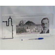 PLACA COMEMORATIVA (16X35X2,5 CM) AO CENTENÁRIO DA DESCOBERTA DA DOENÇA DE CHAGAS, CONFECCIONADA EM ACRÍLICO CRISTAL. AO FUNDO, MONTAGEM COM FOTOGRAFIA DE CASA DE PAU A PIQUE E UMA FAMÍLIA À SUA FRENTE, TENDO UM BARBEIRO (INSETO) NO CANTO ESQUERDO. NA CAMADA SUPERIOR, EM PRIMEIRO PLANO, FOTOGRAFIA DO CIENTISTA CARLOS CHAGAS. NO CANTO ESQUERDO, CONTORNO COM PARTE DA FACHADA DA FUNDAÇÃO CARLOS CHAGAS. POSSUI A INSCRIÇÃO 'HOMENAGEM AO PRESIDENTE DA REPÚBLICA LUIZ INÁCIO LULA DA SILVA / CENTENÁRIO DA DESCOBERTA DA DOENÇA DE CHAGAS - 1909-2009 / FIOCRUZ'. ACONDICIONADA EM CAIXA DE PAPELÃO FORRADA DE PAPEL ALARANJADO. NO INTERIOR DA TAMPA, FOLHETO COM DESCRIÇÃO DA PEÇA. NA PARTE EXTERNA, FOTOGRAFIA DO CIENTISTA.