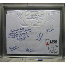 QUADRO (38,5X45,5 CM) COM MOLDURA EM ALUMÍNIO E TAMPO DE VIDRO. EMOLDURA CAMISETA BRANCA, DA 'UFSJ / UNIVERSIDADE FEDERAL DE SÃO JOÃO DEL REI / CAMPUS DONA LINDÚ'. CAMISETA POSSUI NOME E LOGOMARCA DA INSTITUIÇÃO; QUATRO ASSINATURAS; DEDICATÓRIA DO DIRETOR EDUARDO SILVA E DO PREFEITO DEMÉTRIUS ARANTES. NA PARTE POSTERIOR DO QUADRO, TRÊS FOTOGRAFIAS DO PRÉDIO DA FACULDADE DO CAMPUS DONA LINDÚ, E UM CARTÃO EM NOME DO PREFEITO, ENCAMINHANDO O PRESENTE, DATADO DE MAIO/2008.