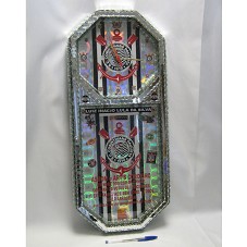 RELÓGIO DE PAREDE (63X28,5X4 CM) COM MOLDURA FORMADA POR PEDAÇOS RETANGULARES DE ESPELHO. POSSUI FUNDO COM ADESIVO FURTACOR E EMBLEMA DO TIME DE FUTEBOL CORINTHIANS. NA PARTE INFERIOR, A INSCRIÇÃO 'LUIZ INACIO LULA DA SILVA / ASBOM E ART'S CORDEIRO EM NOME DOS CBM-DF E PM-DF; DESEAM VOTOS DE FELICIDADES A V. EX. E FAMILIARES BEM C OMO A TODOS QUE O ARRODEIAM / BRASILIA 06 DE NOVEMBRO DE 2009'. ACOMPANHA CARTÃO DE VISITA EM NOME DO AGENTE.
