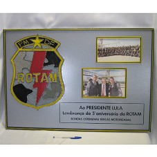 QUADRO (55X80 CM) EMOLDURANDO DUAS FOTOGRAFIAS E O EMBLEMA DA 'PMDF ROTAM'. NA PARTE INFERIOR, A INSCRIÇÃO 'AO PRESIDENTE LULA / LEMBRANÇA DO 5º ANIVERSÁRIO DA ROTAM / RONDAS OSTENSIVAS TÁTICAS MOTORIZADAS'. ATRÁS, EM LETRAS DE EVA, A INSCRIÇÃO 'PM DF 200 ANOS / ROTAM'. EMBLEMA CONFECCIONADO EM LINHAS DE CORES AMARELA, VERMELHA, CINZA, PRETA E PRATEADA, ENTRELAÇADAS E TRANÇADAS EM PREGOS FIXADOS NA BASE DO QUADRO. AS DUAS FOTOGRAFIAS MOSTRAM O PRESIDENTE LULA ENTRE O BATALHÃO DA ROTAM. MOLDURA DO QUADRO CONFECCIONADA COM A MESMA TÉCNICA DO EMBLEMA.