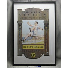 QUADRO (70X47,3 CM) COM MOLDURA PRETA E TAMPO DE VIDRO. EMOLDURA CARTAZ COM DESENHO DE UM ATLETA PULANDO UMA BARRA. DESENHO EMOLDURADO POR UM PÓRTICO ANTIGO, ONDE HÁ A INSCRIÇÃO 'THE GREAT STADIUM SHEPHERD'S BUSH LONDON / THE OLYMPIC GAMES 1908'.