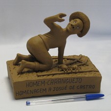 ESCULTURA (14X17X13 CM) CONFECCIONADA EM ARGILA. REPRESENTA UM HOMEM AGACHADO, COM UMA DAS MÃOS ENFIADA NO MANGUE, EM BUSCA DE CARANGUEJOS. AO SEU LADO, DOIS CARANGUEJOS. NA PARTE FRONTAL DA BASE, A INSCRIÇÃO 'HOMEN-CARANGUEJO / HOMENAGEM A JOSUÉ DE CASTRO'. NAS LATERAIS, 'RECIFE - PE 2009' E 'IX CONGRESSO BRASILEIRO DE SAÚDE COLETIVA'. NA PARTE POSTERIOR, 'ELIAS VITALINO'. ACONDICIONADA EM CAIXA DE MADEIRA MDF (18,5X17X25,5 CM).