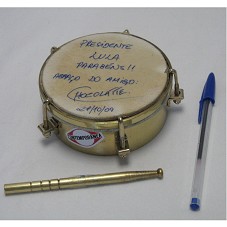 TAMBORIM PEQUENO (11X11X4,5 CM) COM ARMAÇÃO EM METAL DOURADO E PELE DE COURO. NA PELE, A INSCRIÇÃO 'PRESIDENTE LULA / PARABÉNS / ABRAÇO DO AMIGO / CHOCOLATTE / 27/10/09'. ACOMPANHA BAQUETA (12,4 CM) EM METAL DOURADO.