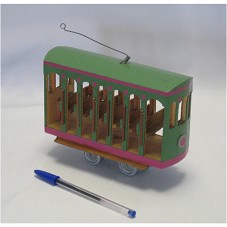 MINIATURA DE UM BONDINHO URBANO (12X18X5,5 CM) CONFECCIONADO EM MADEIRA. PINTADO NA COR VERDE, COM DETALHES EM ROSA. NA PARTE FRONTAL, A INSCRIÇÃO 'RIO'. POSSUI UM ARAME NA PARTE SUPERIOR. NA BASE, NOME E TELEFONE 'WALTER / 25826884'.
