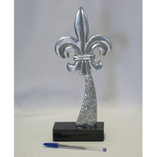 ESCULTURA (28,5 CM) CONFECCIONADA EM METAL PRATEADO, FIXADA EM BASE DE MÁRMORE/GRANITO PRETO (3X12X5 CM). ESCULTURA NO FORMATO DE UMA FLOR DE LIZ, SÍMBOLO DA ESCOLA DE SAMBA FLOR DE LIZ, DE SÃO PAULO. NA LATERAL DIREITA, ASSINATURA DA ARTISTA 'ENZA LM'. NO FUNDO DA BASE, ETIQUETA COM DADOS DA ARTISTA.