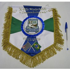 FLÂMULA (28,5X24 CM) CONFECCIONADA EM TECIDO BRANCO, COM FRANJAS DOURADAS. AO CENTRO, BRASÃO DA 'G.R.C.S.E.S. UNIDOS DA VILA MARIA'. POSSUI A INSCRIÇÃO 'A VILA MARIA SAÚDA O COMPANHEIRO LULA / 09/11/2009'. FIXADA EM BASTÃO DE MADEIRA.