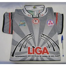 CAMISETA (TAM GG) EM MALHA CINZA, COM DETALHES EM PRETO. POSSUI ESTAMPA CONTENDO A INSCRIÇÃO 'LIGA INDEPENDENTE DAS ESCOLAS DE SAMBA DE SÃO PAULO', COM LOGOMARCA E BRASÕES DAS ESCOLAS PARTICIPANTES. ATRÁS, MESMA ESTAMPA E 'PRESIDENTE LULA'.