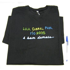 CAMISETA (TAM GG) EM MALHA PRETA, DE MANGA CURTA. NA FRENTE, BORDADA NAS CORES DA BANDEIRA BRASILEIRA, A INSCRIÇÃO 'LULA, CABRAL, PAES / RIO 2016 / É BOM DEMAIS'.