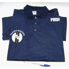 CAMISA PÓLO (TAM G), NA COR AZUL MARINHO, DE MANGAS CURTAS. NA FRENTE, BORDADO EM BRANCO, 'PMDF / TEATRO RODOVIA'. ATRÁS, 'CPCAS / GPET / POLÍCIA MILITAR DO DISTRITO FEDERAL'.