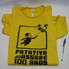 CAMISETA (TAM G) EM MALHA AMARELA, DE MANGA CURTA. NA FRENTE, ESTAMPA EM PRETO, COM DESENHO ESTILO XILOGRAVURA, MOSTRANDO O POETA VOANDO COM CINCO POMBAS, E A INSCRIÇÃO 'PATATIVA DO ASSARÉ / 100 ANOS'. ATRÁS, POEMA DE AUTORIA DO MESMO E 'REALIZAÇÃO: PREFEITURA M. DE ASSARÉ / ADM: EVANDERTO ALMEIDA'. NA MANGA, LOGOMARCA DA PREFEITURA.