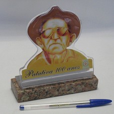 PLACA (13X12,5 CM) CONFECCIONADA EM ACRÍLICO, COM ESTAMPA CONTENDO DESENHO, EM PLANO AMERICANO, DO POETA PATATIVA DO ASSARÉ, EM TONS DE AMARELO E MARROM. POSSUI A INSCRIÇÃO 'PATATIVA 100 ANOS' E LOGOMARCA DA 'PREFEITURA M. DE ASSARÉ / ADM: EVANDERTO ALMEIDA'. FIXADA EM BASE (2X14X5 CM) DE MÁRMORE ROSADO.