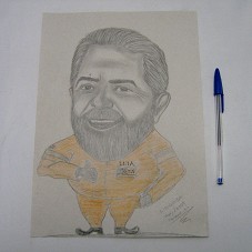 DESENHO (29,7X21 CM) FEITO À GRAFITE E LÁPIS DE COR, EM PAPEL A4 RECICLADO, DE TOM BEGE, MOSTRANDO O PRESIDENTE LULA VESTIDO COM MACACÃO LARANJA DA 'PETROBRÁS'. NO CANTO INFERIOR DIREITO, ASSINATURA DO ARTISTA 'J. MENDONÇA / NOV. 2009 / MANAUS-AM'.