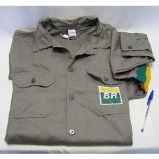JALECO / CAMISA (TAM 56) CONFECCIONADA EM TECIDO CINZA, DE MANGA COMPRIDA, COM DOIS BOLSOS FRONTAIS. EM UM DELES, LOGOMARCA DA 'PETROBRÁS'. NAS MANGAS, FAIXAS NAS CORES AMARELO E VERDE.