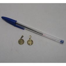 TRÊS PINGENTES IGUAIS (15 MM CADA), MEDALHAS DE SANTO, CONFECCIONADOS EM METAL BRONZEADO. NO ANVERSO, IMAGEM DE UMA CRUZ, COM INSCRIÇÕES; NO REVERSO, FIGURA HUMANA. ACONDICIONADOS EM SACO DE VELUDO AZUL.