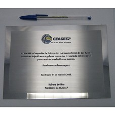 PLACA (15X21 CM) EM AÇO ESCOVADO, CONTENDO A GRAVAÇÃO 'CEAGESP / 40 ANOS NA MESA DE TODOS OS BRASILEIROS / A CEAGESP - ... - COMEMORA HOJE 40 ANOS ORGULHOSA E GRATA POR TER CONTADO COM SEU APOIO PARA CONSTRUIR UMA HISTÓRIA DE SUCESSO. RECEBA NOSSAS HOMENAGENS. SÃO PAULO, 31 MAIO DE 2009 / RUBENS BOFFINO / PRESIDENTE DA CEAGESP'. ACONDICIONADA EM ESTOJO FORRADO DE VELUDO PRETO.