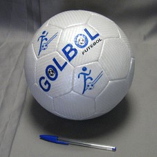 BOLA DE FUTEBOL, NA COR BRANCA, COM A INSCRIÇÃO 'GOLBOL FUTEBOL' EM AZUL; E LOGOMARCA DO 'INSTITUTO DOS PIONEIROS DE AGUAS LINDAS/GO / INPALGO'.