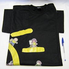 CAMISETA (TAM GG) EM MALHA PRETA, DE MANGA CURTA. POSSUI ESTAMPA EM AMARELO, MOSTRANDO PARTE DE UM SOL, COM DESENHO DE CRIANÇAS SOBRE ELE. EM UMA DAS MANGAS, A INSCRIÇÃO 'FUNDAÇÃO CRIANÇA DE SÃO BERNARDO DO CAMPO'.