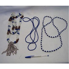CONJUNTO DE TRÊS COLARES LONGOS, DE CULTURA AFRO-BRASILEIRA, CONFECCIONADOS EM MIÇANGAS E CONTAS. O PRIMEIRO, DE CORDÃO FINO, CONFECCIONADO EM MIÇANGAS AZUIS. O SEGUNDO, EM CONTAS AZUIS E BRANCAS, INTERCALADAS. O TERCEIRO, DE CORDÃO GROSSO, EM MIÇANGAS BRANCAS E MARRONS, COM DETALHES EM CANUTILHOS AZUIS E PEDRAS CILÍNDRICAS DE CERÂMICA BRANCA. EM CADA PEDRA, UM DESENHO DIFERENTE.