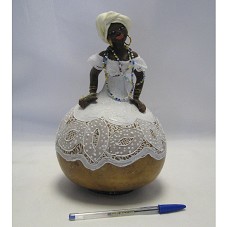 ESCULTURA (23,5 CM) CONFECCIONADA EM CABAÇA, REPRESENTANDO UMA BAIANA. POSSUI COLARES DE MIÇANGAS COLORIDAS E BRINCOS EM ARGOLAS DOURADAS.O VESTIDO É PINTADO NA PRÓPRIA CABAÇA, COM DETALHE EM RENDA NA PARTE SUPERIOR. NA PARTE POSTERIOR, A INSCRIÇÃO 'VERA CRUZ / SSA-BA / 2009'.