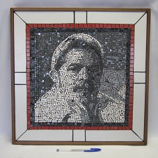 QUADRO (46,5X46,5 CM) COM MOLDURA E BASE EM MADEIRA. EMOLDURA MOSAICO EM CERÂMICAS BRANCA, PRETA E CINZA, RETRATANDO O PRESIDENTE LULA. BORDADURA EM MOSAICO NAS CORES VERMELHA E BRANCA. NA PARTE POSTERIOR, ETIQUETA COM NOME E ENDEREÇO DO AGENTE.
