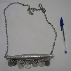 COLAR EM METAL PRATEADO, COM CORDÃO EM CORRENTE COMPRIDA. POSSUI OBJETO METÁLICO, EM LOSANGO, COMO PINGENTE, COM ALGUMAS MOEDAS EM MESMO MATERIAL.