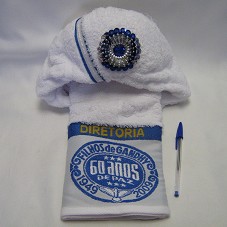 TURBANTE EM TOALHA BRANCA, COM DETALHES EM AZUL. NA PARTE POSTERIOR, BORDADO EM AZUL, O EMBLEMA DOS 'FILHOS DE GANDHY' E A INSCRIÇÃO 'DIRETORIA / 60 ANOS DE PAZ / 1949-2009'. NA PARTE FRONTAL, UMA ROSA BORDADA EM PEDRARIA, COM MIÇANGAS E LANTEJOULAS AZUIS E PRATEADAS.