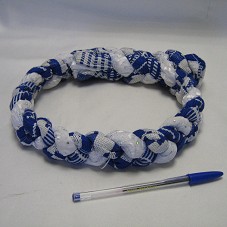 COROA / TIARA (4X22X22 CM) CONFECCIONADA COM DUAS TIRAS DE TECIDOS, UMA AZUL E BRANCA E OUTRA TODA BRANCA COM LANTEJOULAS FURTACOR. TIRAS TRANÇADAS E COSTURADAS, FORMANDO A COROA.
