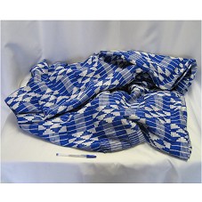 MANTO (311X98 CM) CONFECCIONADO EM TIRAS DE TECIDO COM DESENHOS GEOMÉTRICOS, NAS CORES AZUL E BRANCO.
