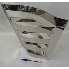 VASO DECORATIVO (28X38 CM) EM AÇO INOX, DE FORMATO TRAPEZOIDAL, COM LATERAIS EM TIRAS INTERCALADAS. ACONDICIONADO EM EMBALAGEM PRÓPRIA (31X39X12,5 CM).