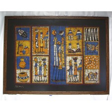 QUADRO (94,5X127 CM) COM MOLDURA EM MADEIRA LAMINADA E TAMPO DE VIDRO. EMOLDURA TECIDO PRETO COM ESTAMPA CENTRAL NAS CORES LARANJA, AZUL, BRANCO E PRETO, MOSTRANDO DESENHOS DE PESSOAS NEGRAS TRABALHANDO, TRIBOS, E INSTRUMENTOS REGIONAIS. NO CANTO INFERIOR ESQUERDO, ASSINATURA (NÃO IDENTIFICADA).