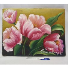 QUADRO (30X40 CM) SEM MOLDURA COM PINTURA SOBRE TELA RETRATANDO UM CONJUNTO DE FLORES ROSAS, SOBRE FUNDO EM TONS DE MARROM. NO CANTO INFERIOR DIREITO, A INSCRIÇÃO 'CRAS / CARMO DO PARANAÍBA / MG'. TELA PRESA EM CHASSIS DE MADEIRA.