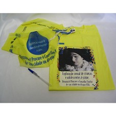 CAMISETA (TAM G) EM MALHA AMARELA, SEM MANGA. NA FRENTE, ESTAMPA MOSTRANDO A FOTOGRAFIA DE UMA CRIANÇA VESTIDA DE PIERROT, CHORANDO, E A INSCRIÇÃO 'EXPLORAÇÃO SEXUAL DE CRIANÇAS E ADOLESCENTES É CRIME. DENUNCIE. PROCURE O CONSELHO TUTELAR DE SUA CIDADE OU DIQUE 100'. ATRÁS, NOME E LOGOMARCAS DE INSTITUIÇÕES PRIVADAS, FEDERAIS, ESTADUAIS E MUNICIPAIS. ACOMPANHA LENÇO TRIANGULAR, EM TECIDO AMARELO, UMA FITA AZUL E OUTRA BRANCA, TODOS COM MESMA INSCRIÇÃO. ACONDICIONADO EM SACO PLÁSTICO.