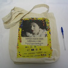 SACOLA (31,5X29 CM) EM ALGODÃO CRU, COM ALÇA MÉDIA. NA FRENTE, ESTAMPA MOSTRANDO A FOTOGRAFIA DE UMA CRIANÇA VESTIDA DE PIERROT, CHORANDO, E A INSCRIÇÃO 'EXPLORAÇÃO SEXUAL DE CRIANÇAS E ADOLESCENTES É CRIME. DENUNCIE. PROCURE O CONSELHO TUTELAR DE SUA CIDADE OU DIQUE 100'. ABAIXO DA ESTAMPA, NOMES E LOGOMARCAS DE INSTITUIÇÕES PRIVADAS, FEDERAIS, ESTADUAIS E MUNICIPAIS.