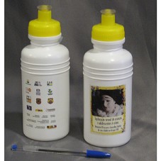 DUAS GARRAFAS DE ÁGUA (20 CM), TIPO SQUEEZE, NA COR BRANCA, COM TAMPA AMARELA. POSSUI ESTAMPA MOSTRANDO A FOTOGRAFIA DE UMA CRIANÇA VESTIDA DE PIERROT, CHORANDO, E A INSCRIÇÃO 'EXPLORAÇÃO SEXUAL DE CRIANÇAS E ADOLESCENTES É CRIME. DENUNCIE. PROCURE O CONSELHO TUTELAR DE SUA CIDADE OU DIQUE 100'. ATRÁS, NOME E LOGOMARCAS DE INSTITUIÇÕES PRIVADAS, FEDERAIS, ESTADUAIS E MUNICIPAIS.