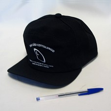 BONÉ EM TECIDO PRETO. NA FRENTE, ESTAMPA BRANCA, DESENHO OVAL COM UMA MEIA LUA DENTRO, E A INSCRIÇÃO 'VILA SÃO COTTOLENGO / NEM A LUA PRECISA DE CORPO INTEIRO PARA ENCANTAR O MUNDO'. ATRÁS, '(62) 3506-9000 / WWW.COTTOLENGO.ORG.BR'. ACONDICIONADO EM SACOLA DE TNT BRANCO, COM MESMA INSCRIÇÃO E DESENHO DO MASCOTE 'BENTINHO'.