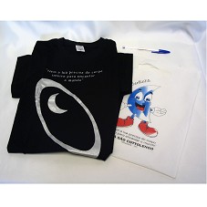 CAMISETA (TAM G) EM MALHA PRETA, DE MANGA CURTA, TIPO BABYLOOK. NA FRENTE, ESTAMPA PRATEADA, DESENHO OVAL COM UMA MEIA LUA DENTRO, E A INSCRIÇÃO 'NEM A LUA PRECISA DE CORPO INTEIRO PARA ENCANTAR O MUNDO'. ATRÁS, 'VILA SÃO COTTOLENGO / TRINDADE -GO'. ACONDICIONADA EM SACOLA DE TNT BRANCO, COM MESMA INSCRIÇÃO E DESENHO DO MASCOTE 'BENTINHO'.