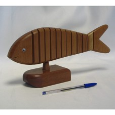 ARTESANATO EM MADEIRA (9X30,5X3 CM), ESCULTURA ARTICULADA REPRESENTANDO UM PEIXE. FIXADO EM BASE DE MESMO MATERIAL (3,5X12,5X7 CM).