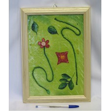 QUADRO (33X24 CM) COM MOLDURA EM MADEIRA CLARA E PINTURA TEXTURIZADA SOBRE MADEIRA. PINTURA SOBRE FUNDO ESVERDEADO, COM FIGURAS DE FLOR E FOLHAS.
