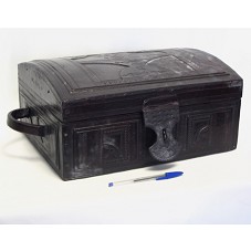BAÚ (16X39X30 CM) CONFECCIONADO EM MADEIRA, REVESTIDO EM COURO E, INTERNAMENTE, EM VELUDO MARROM. POSSUI DUAS ALÇAS LATERAIS E FECHO FRONTAL PARA COLOCAÇÃO DE CADEADO. COURO TRABALHADO COM MOTIVOS GEOMÉTRICOS.