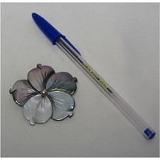 BROCHE (50X50 MM), NO FORMATO DE UMA FLOR, CONFECCIONADO EM MADREPÉROLA-NACAR. POSSUI TONALIDADE PRATA ACINZENTADA, COM BRILHO FURTACOR. ACOMPANHA CARTÃO EM NOME DO AGENTE. ACONDICIONADO EM ESTOJO DE MADEIRA LAQUEADA, COM ETIQUETA DO FABRICANTE NA TAMPA. ESTE, EM SACO DE TECIDO VINHO.