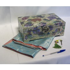 PORTA-JÓIA (10,5X30X19 CM) CONFECCIONADO EM MADEIRA, REVESTIDO EM MADREPÉROLA-NACAR, COM DESENHO DE FLORES EM TONS LILÁS E FURTACOR. POSSUI UMA DIVISÓRIA INTERNA, E DUAS PRATELEIRAS DIVIDIDAS E SOLTAS. ESTAS, EM LACA PRETA E REVESTIMENTO EM VELUDO VERMELHO. NA PARTE INTERNA DA TAMPA, UM ESPELHO. FECHO NO FORMATO DE UM PEIXE, CONFECCIONADO EM METAL PRATEADO. ACOMPANHA CHAVE PRESA A CHAVEIRO DE TECIDO, ACONDICIONADA EM SACO DE TECIDO ROSA; E TECIDO DE SEDA, NAS CORES AZUL E ROSA, COM BORDADO DE FLORES. ACOMPANHA TEXTO COM BREVE HISTÓRICO DA TÉCNICA E ETIQUETA DO FABRICANTE. ACONDICIONADO EM CAIXA DE PAPELÃO BEGE E MARROM, COM DESENHO NA TAMPA.