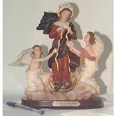 IMAGEM DA VIRGEM DESATADORA DOS NÓS (19X11,5X24 CM) EM RESINA, EM BASE DE MESMO MATERIAL( 19X11,5X2 CM) NA COR MARROM AVERMELHADO, COM PLACA DOURADA, NA FRENTE, CONTENDO A INSCRIÇÃO 'V. DESATA LOS NUDOS / SANTINI GOLD'. IMAGEM DA SANTA COM VESTIDO VERMELHO E MANTO AZUL MARINHO, ACOMPANHADA DE DOIS ANJOS AJOELHADOS AOS SEUS PÉS, DESATANDO NÓS. ESTÃO SOBRE UMA NUVEM E ELA PISANDO SOBRE UMA SERPENTE. ACOMPANHA CERTIFICADO DE AUTENTICIDADE DA 'SANTINI GOLD', EM CARTÃO DOURADO, COM INSCRIÇÕES EM SEU INTERIOR E DO LADO DE FORA 'SANTINI GOLD CERTIFICADO DE AUTENTICIDAD / SANTINI GOLD ITALY STYLE'.