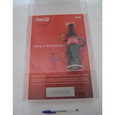 QUADRO (45,5X28,5X 8,8CM) TIPO CAIXA, EM ACRÍLICO TRANSPARENTE. POSSUI FUNDO FORRADO EM PAPEL VERMELHO, CONTENDO A INSCRIÇÃO 'ABRA A FELICIDADE / RIO DE JANEIRO. FELICIDADE É TER AS OLIMPÍADAS AQUI. / A COCA-COLA BRASIL PARABENIZA OS CARIOCAS, A PREFEITURA, O GOVERNO DO ESTADO E O GOVERNO FEDERAL POR MAIS ESSA IMPORTANTE CONQUISTA. / DESDE 1928, A COCA-COLA AJUDA A REALIZAR O SONHO DAS OLIMPÍADAS EM VÁRIAS CIDADES DO MUNDO.'. NA LATERAL DIREITA, UMA GARRAFA DE VIDRO DE 250 ML DE COCA-COLA, TENDO A LOGOMARCA DA COCA-COLA NO RÓTULO, E A INSCRIÇÃO 'SUPPORTING OLYMPIC DREAMS SINCE 1928 / COPENHAGEN 2009' E SÍMBOLO DAS OLÍMPIADAS. GARRAFA FIXADA EM BASE DE ACRÍLICO. E, NA PARTE INFERIOR, PLACA (3X11,5 CM) DE METAL PRATEADO COM A INSCRIÇÃO 'LUIZ INÁCIO LULA DA SILVA / PRESIDENTE DA REPÚBLICA FEDERATIVA DO BRASIL'. ACONDICIONADO EM CAIXA FORRADA DE TECIDO VERMELHO.